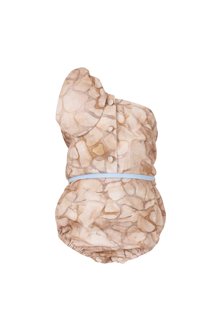 Pelele para bebé confeccionado 100%en algodón. Lazo ajustable en la parte superior izquierda, detalle en azul.