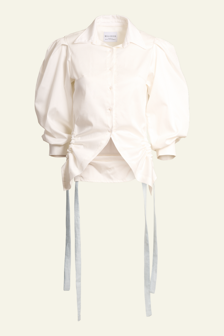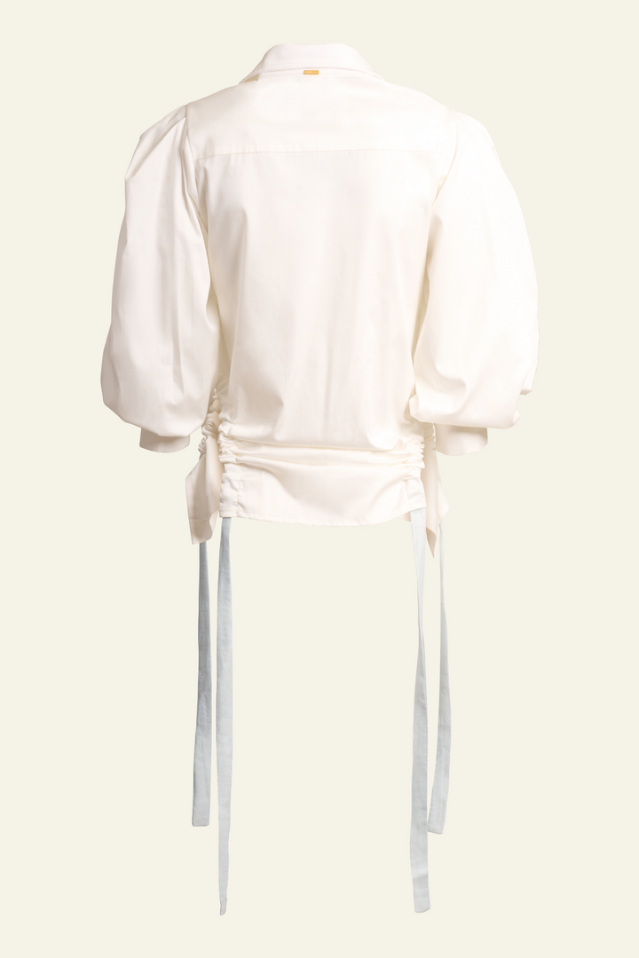 Camisa blanca con cuello clasico y mangas abullonadas que le dan un toque voluminoso y elegante.Corte delantero que crea una silueta asimetrica y un detalle de tiras que culegan verticalmente.
