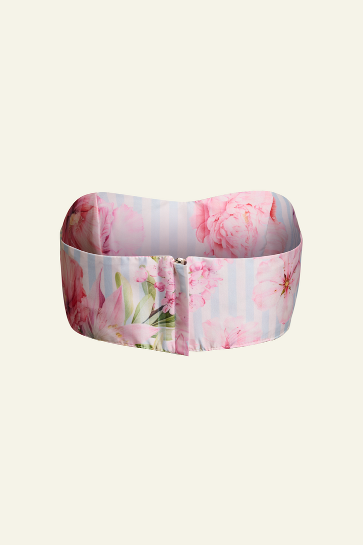 Vestido corto en seda rigida, cuello rectangular , falda acampanada en pliegues. Incluye crop top.