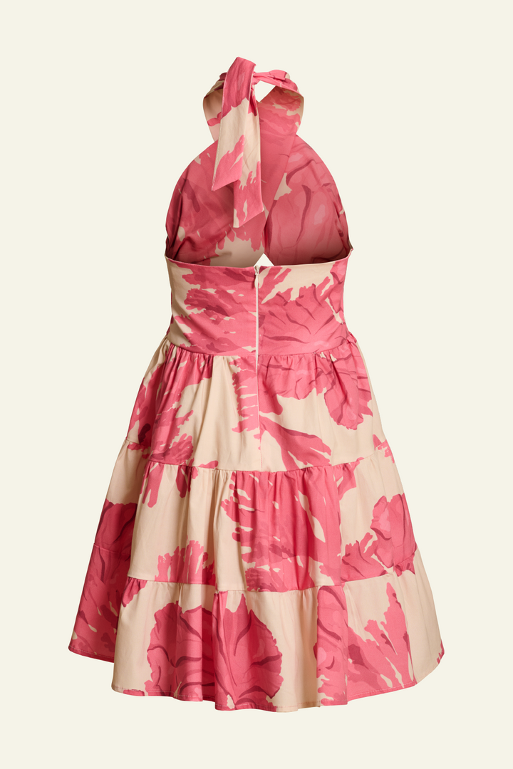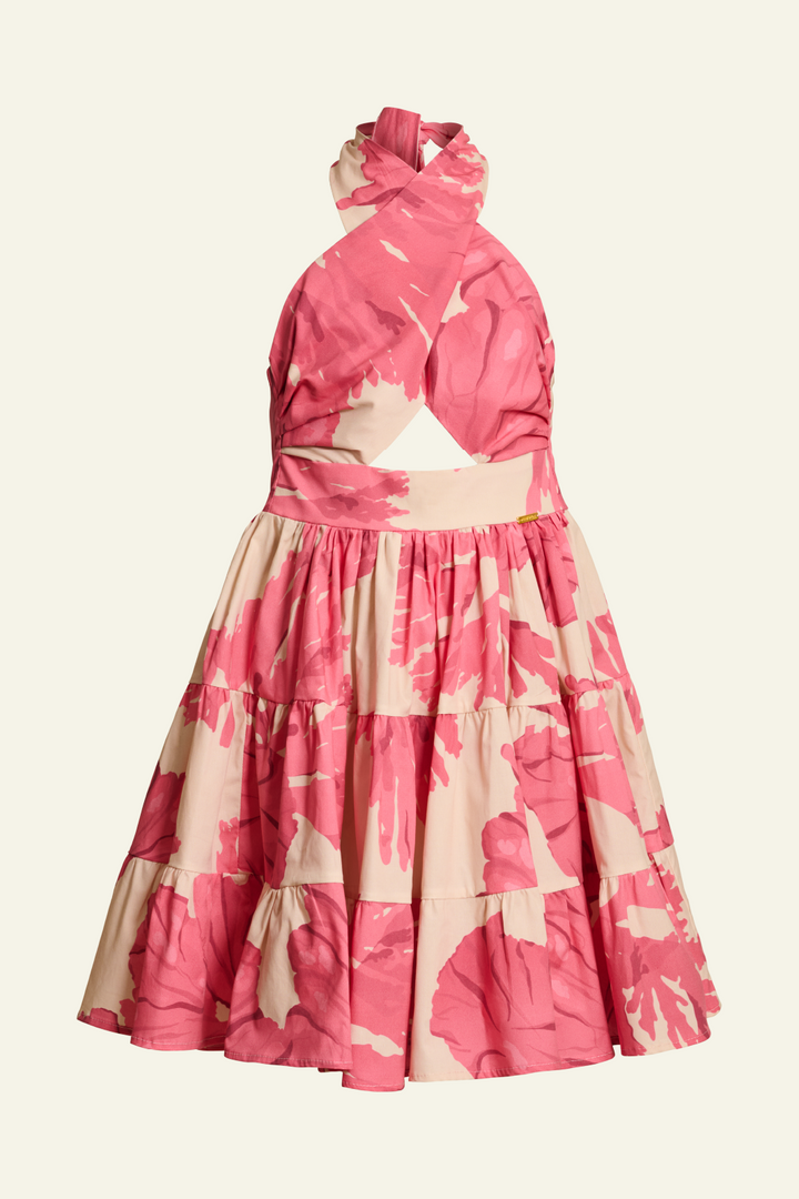 Vestido corto con estampado floral en tono rosa y blanco. Escote halter cruzado en parte delantera, con corte triangular en abdomen. Disponible para mamá y niña.