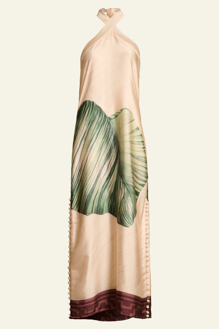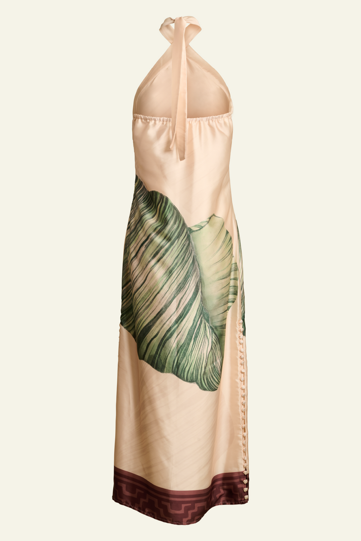 Vestido largo con cuello cruzado en un print muy sutil y suave, detalles al costado, espaldar semidescubierto.