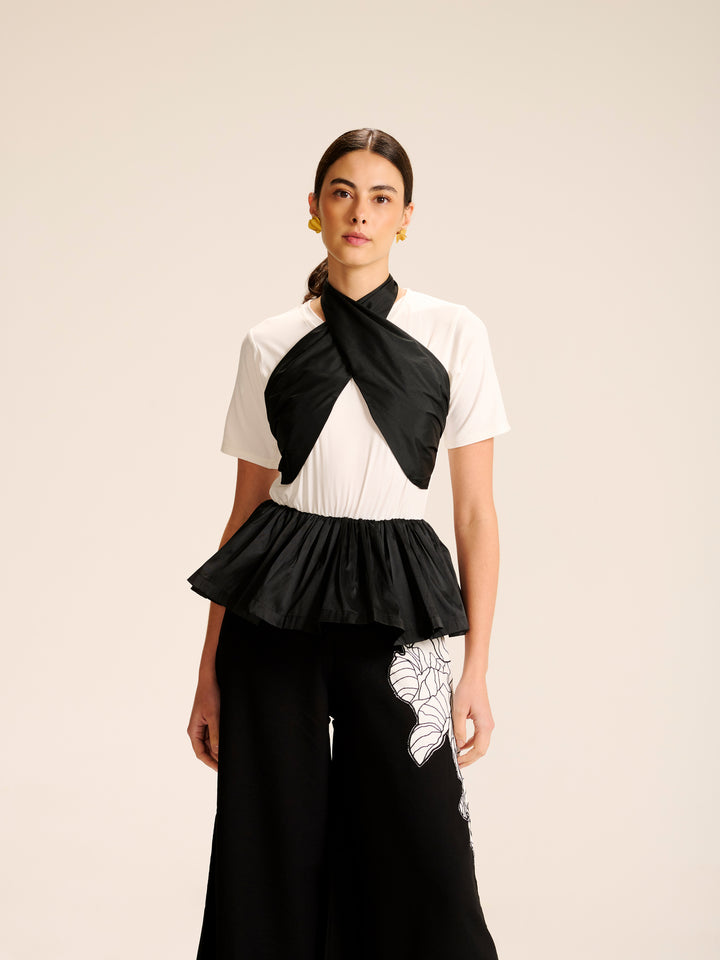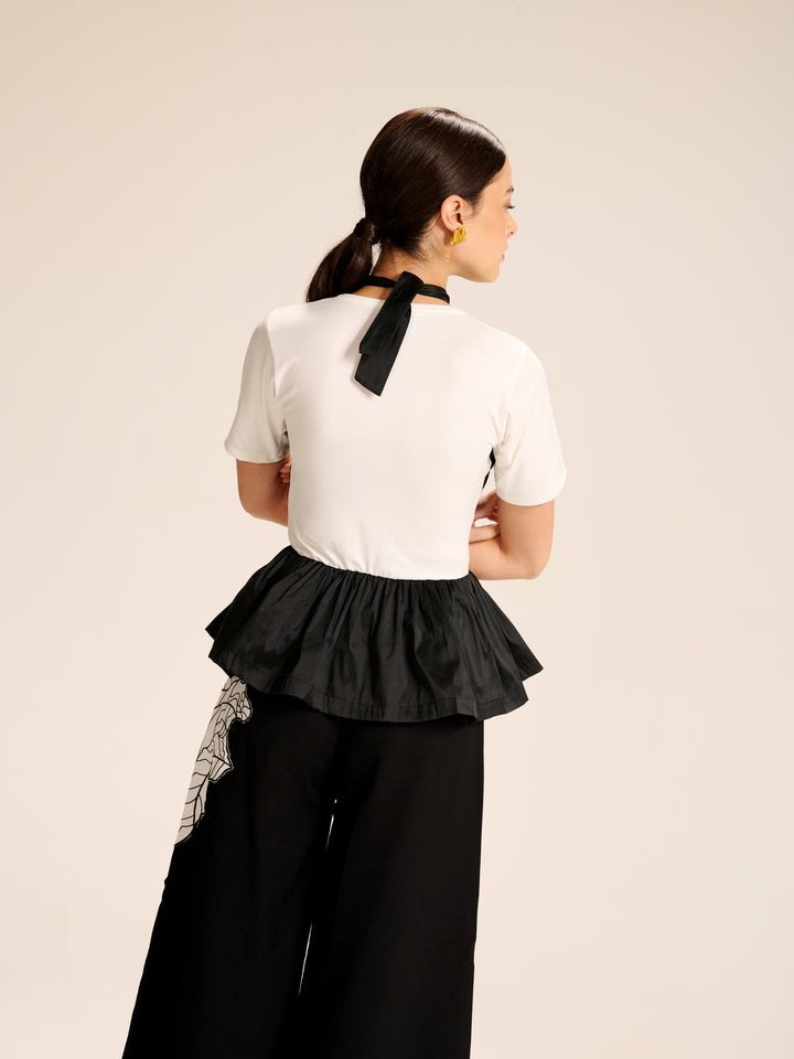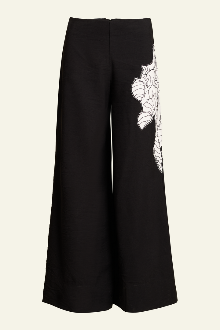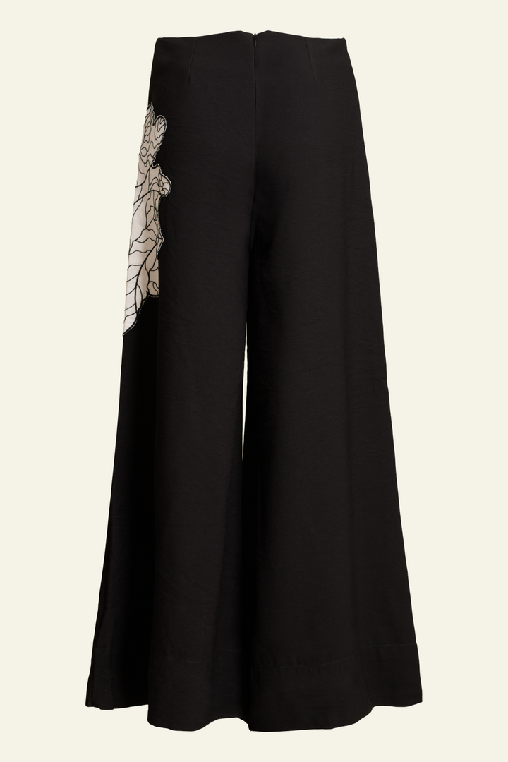 Pantalón largo con diseño amplio y negro. Cuenta con diseño en lateral izquierdo. Cierre trasero