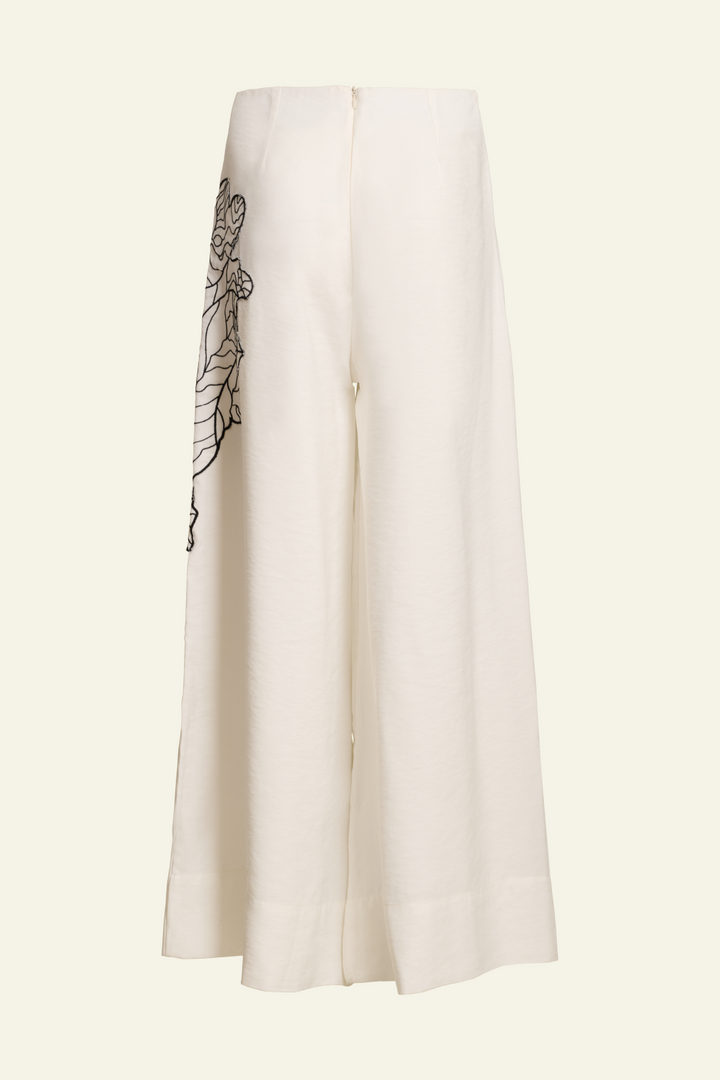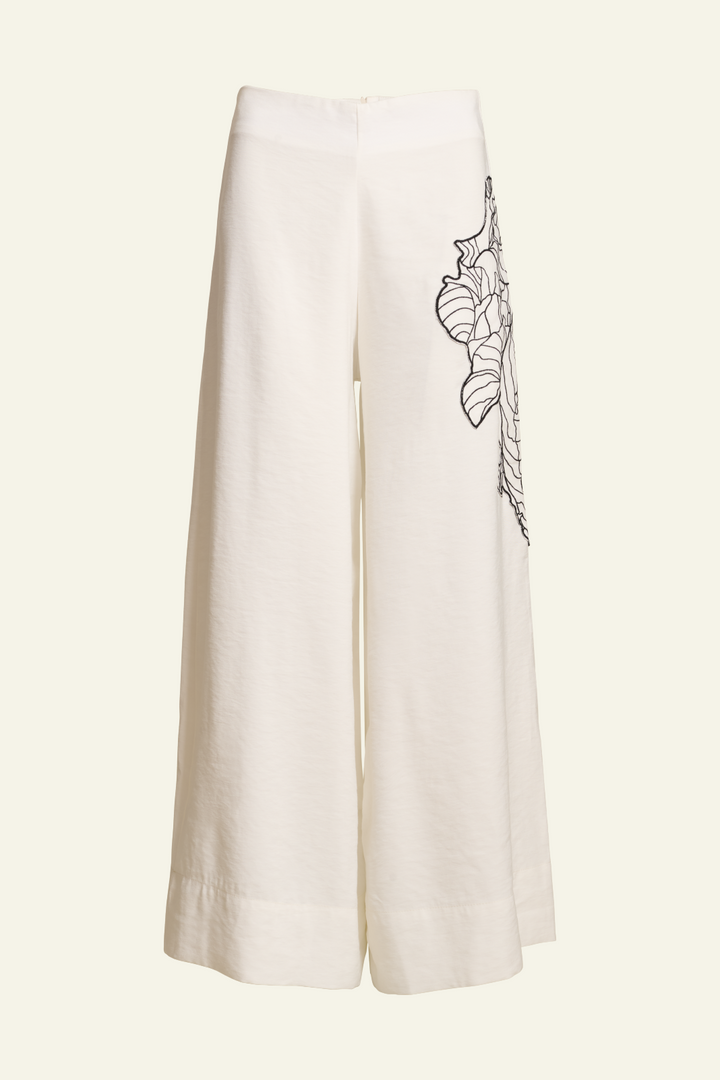 Pantalón largo con diseño amplio y marfil. Cuenta con diseño en later izquierdo. Cierre trasero
