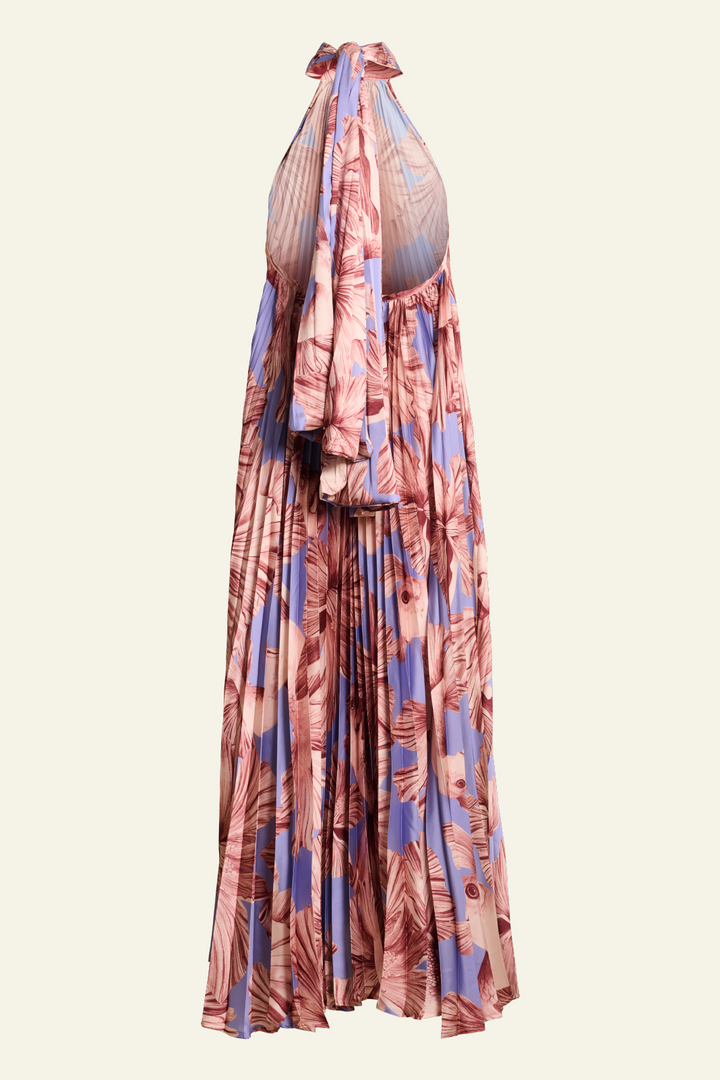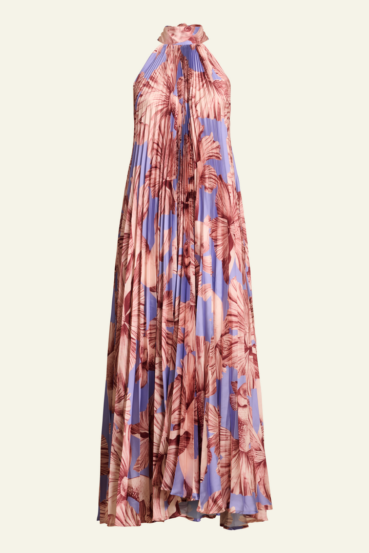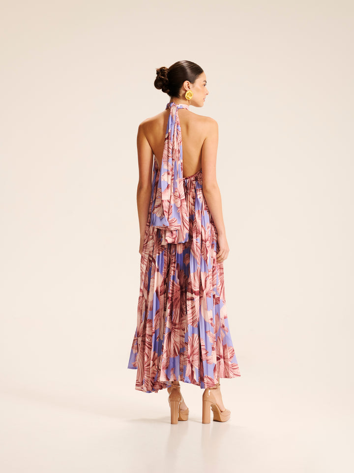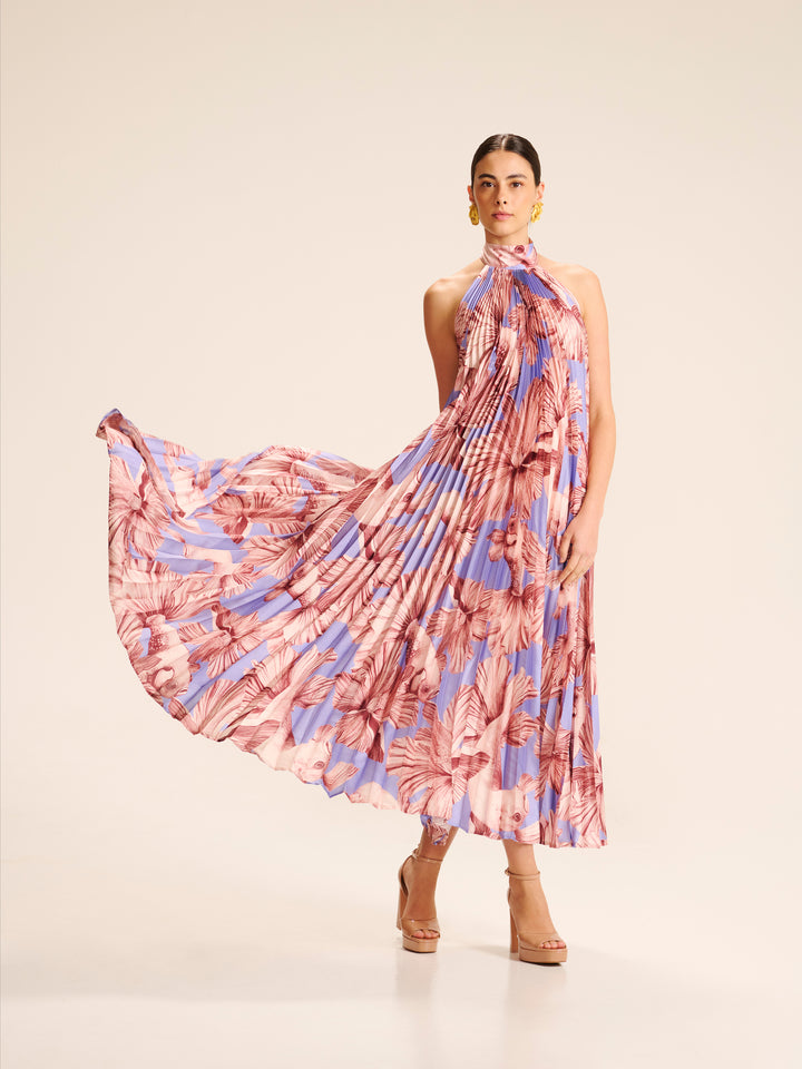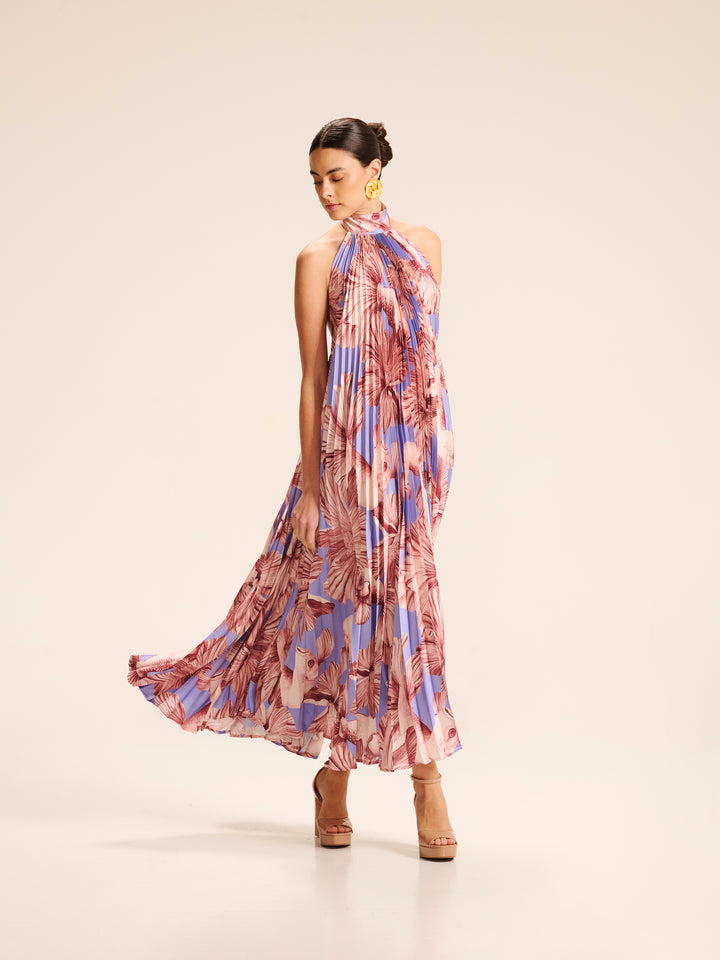 Vestido largo y plisado, con un print floral en tonos azules y rosados. El cuello es halter, atado al cuello y la falda cae recta. Ideal para lucir elegante en ocasiones especiales.