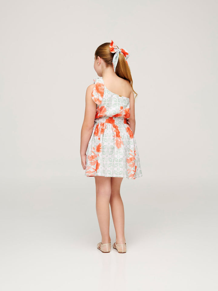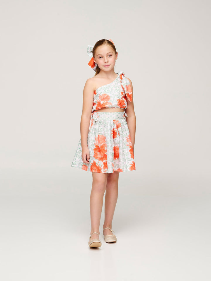 Crop top tejido en algodón con lazo ajustable lado izquierdo, estampado en flores naranja. Disponible en mami y yo.