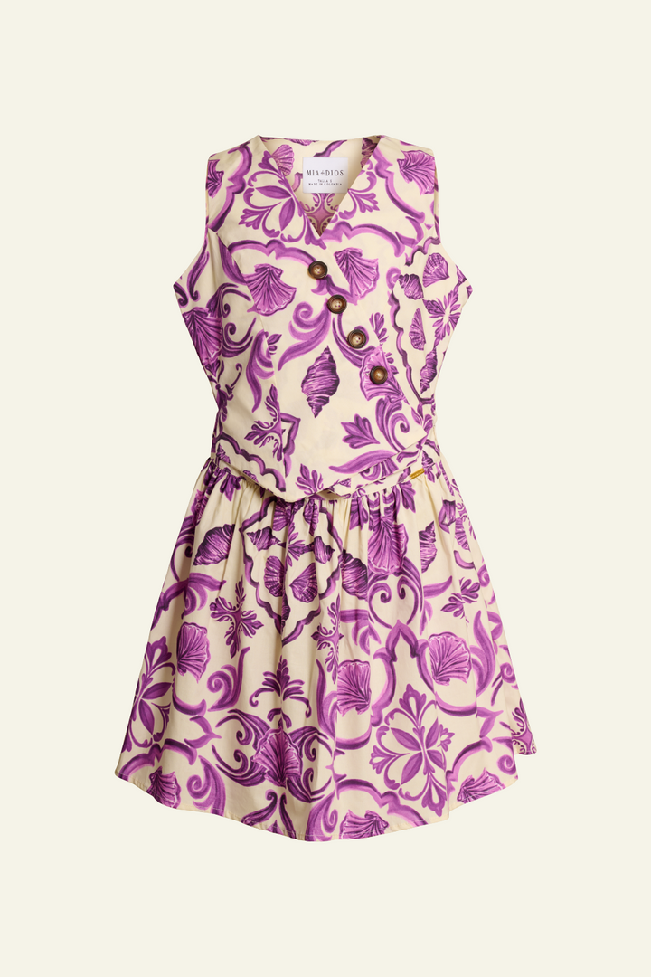 Vestido sin mangas y cuello en V pronunciado, botones marrnes en parte delantera . La cintura marcada con un diseño en v, falda acampanada y corta. Disponible para mamá y niña.