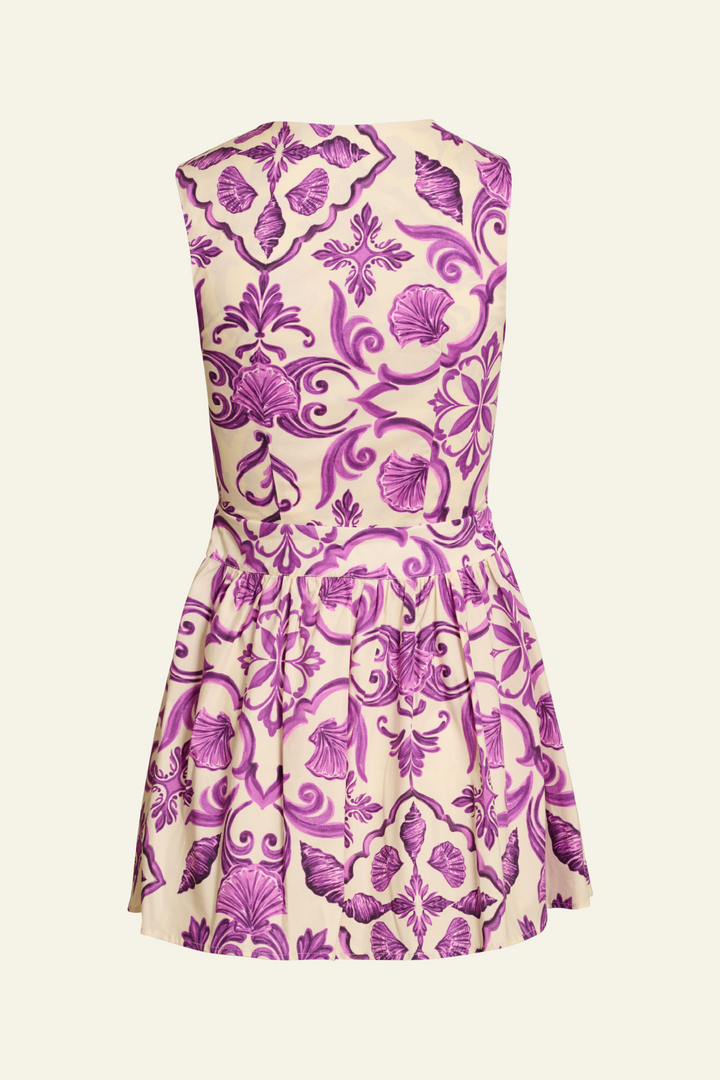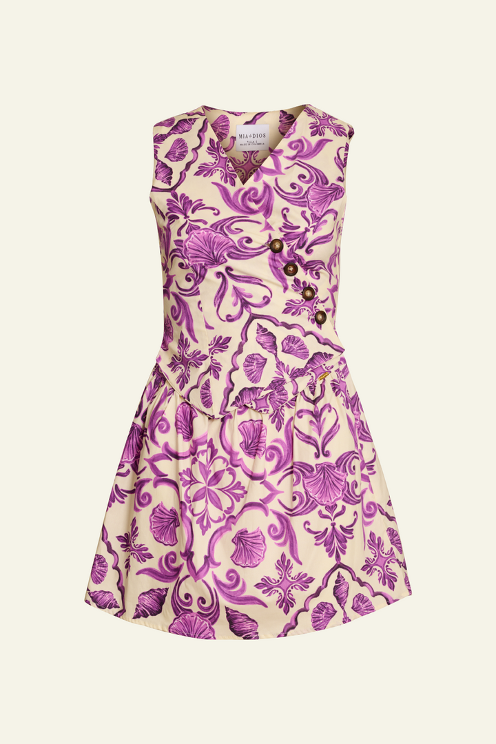 Vestido sin mangas y cuello en V pronunciado, botones marrnes en parte delantera . La cintura marcada con un diseño en v, falda acampanada y corta. Disponible para mamá y niña.