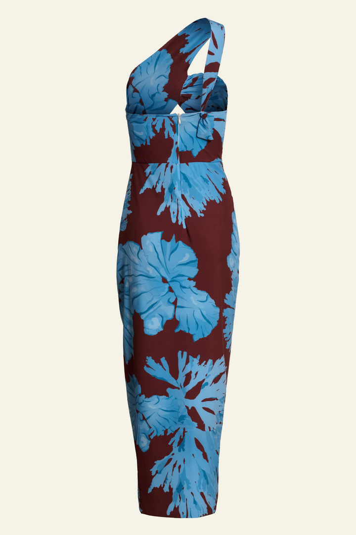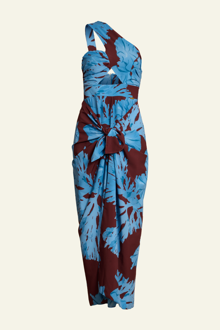 Vestido sin tirantes es un print tropical,diseño asimetrico que se envuelve en el torso y se anuda en la cintura. La falda del vestido cae recta, perfecta para cualquier ocasión.