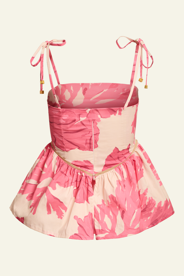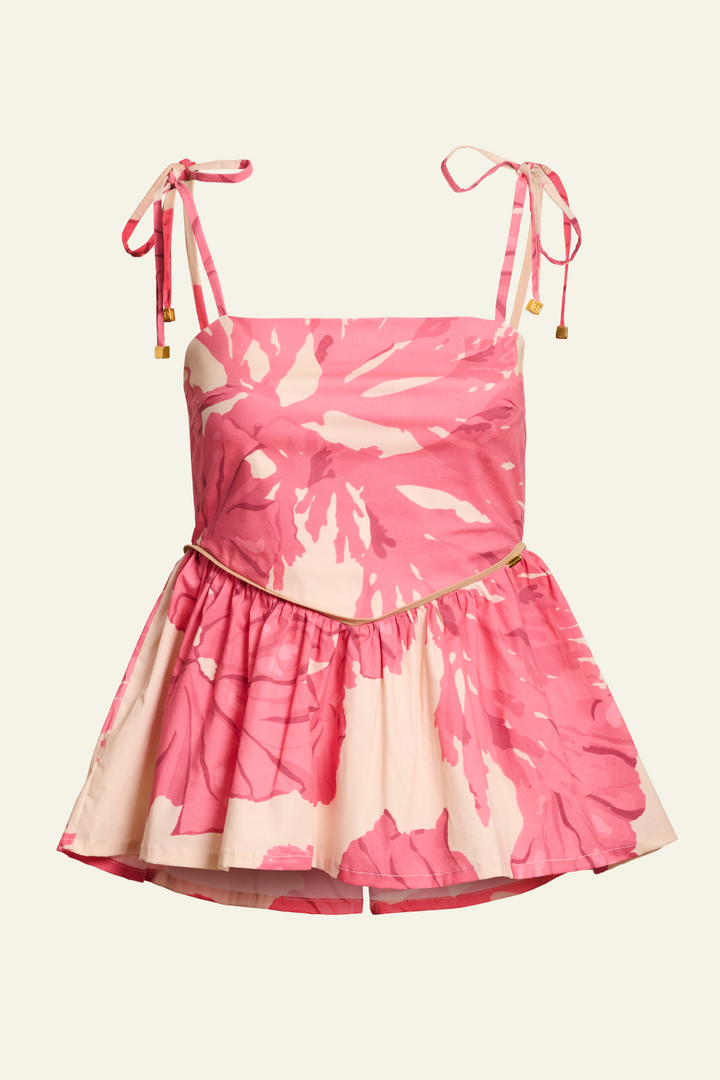 Top para mamá en tonos rosa y blancos. Tirantes finos que se anudan a los hombros adornados con cuentas doradas. Diseño en V. Disponible para mamá y niña.