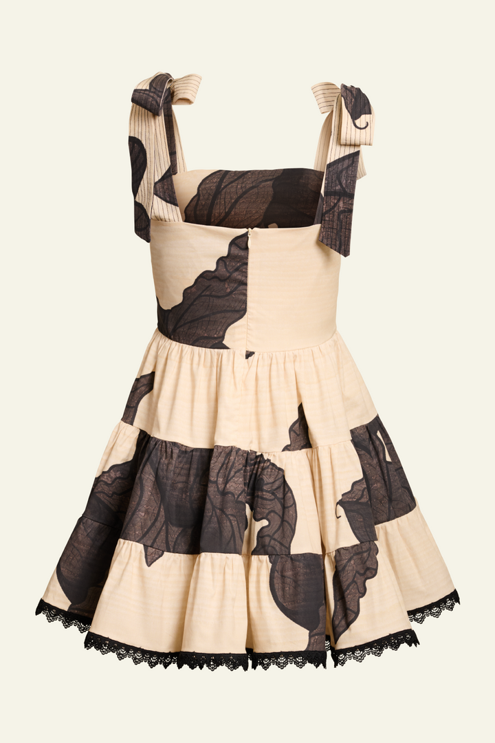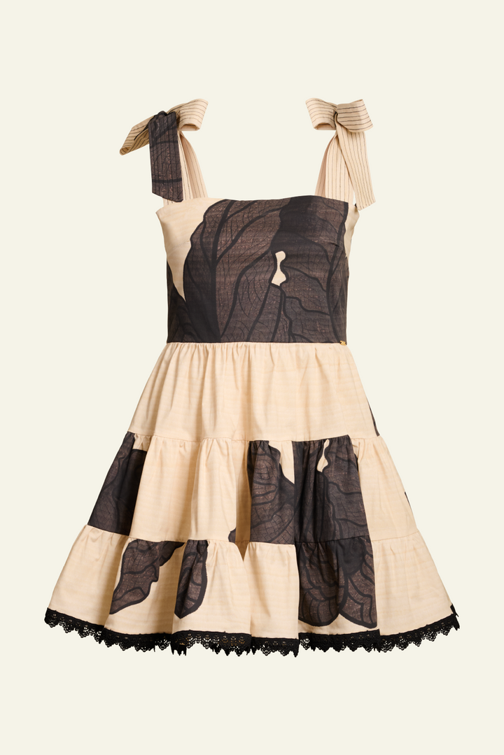 Vestido corto con tirantes anudados en la parte superrior con lazos grandes. La falda con varios volantes, cierre en espaldar.