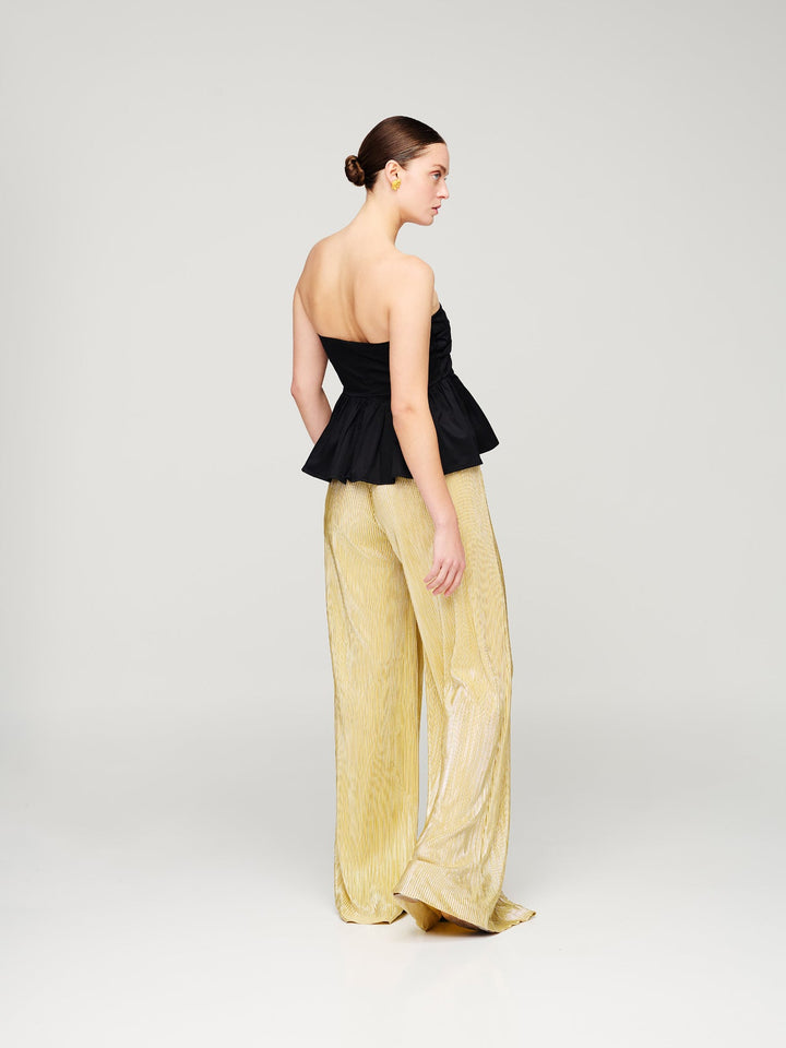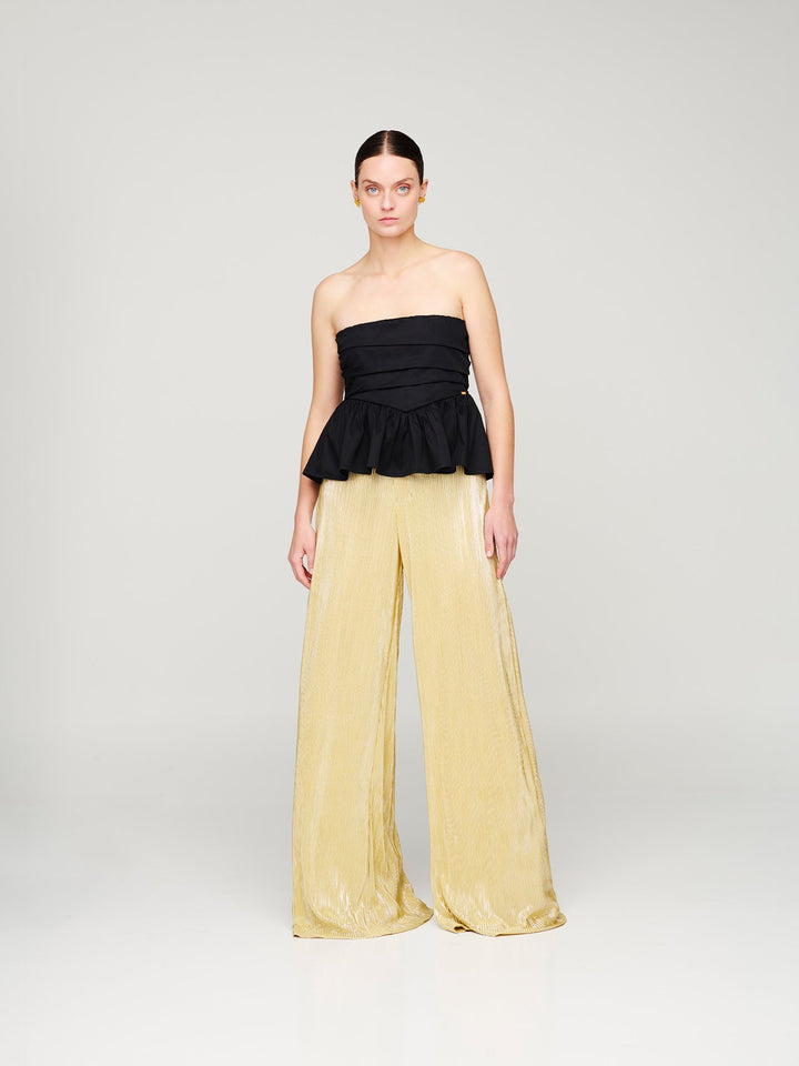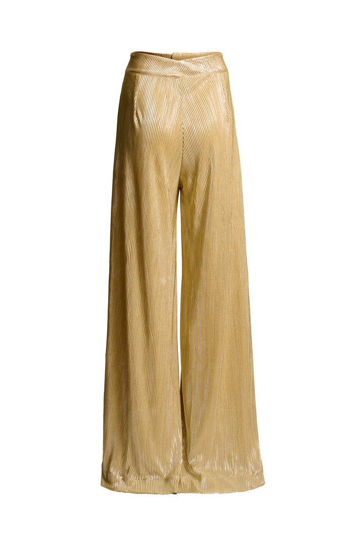 Pantalón largo dorado, cierre delantero, botones delanteros tejido en seda plisada.